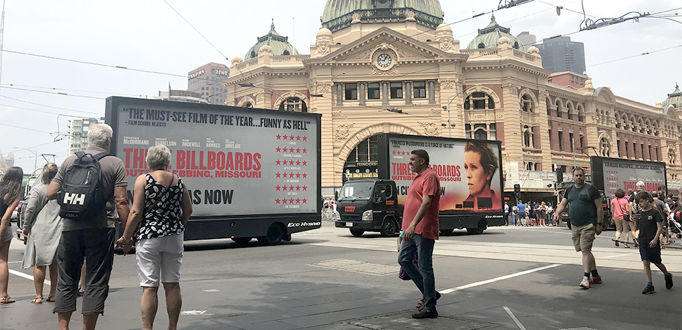 Project 20th Century Fox disrupted metro area's in Melb & Syd with highly visible advertising to gain awareness for new movie launch. Three of our Mobile Billboards were the perfect format to promote the potential Oscar winning movie, Three Billboards Outside Ebbing Missouri. Melburnians and Sydney-siders would have found it hard to miss our 3-sided [...]